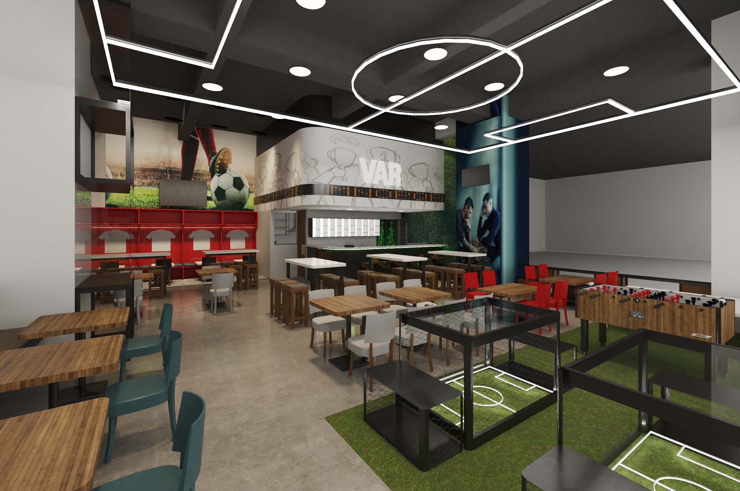 Creamos una experiencia inmersiva para los amantes del fútbol, inspirada en la energía de la Champions League. Desde la barra estilo VAR hasta los murales y la iluminación que simula una cancha, cada detalle está diseñado para que la pasión por el fútbol se viva en cada rincón. Más que un restaurante, Champions es un templo para los fanáticos.